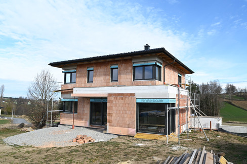 Verbaut wurden dabei: - Fenster aus Kunststoff-Aluminium in flächenbündiger Ausführung, unter anderem mit Eckverbindungen - Hebeschiebetür aus Kunststoff-Aluminium - Aluminium-Hauseingangstür - Raffstores mit 80R Lamelle - Vorbaurollläden mit Aluminiumpanzer - Kombinierter Insektenschutz (Rollos/Schieberahmen)